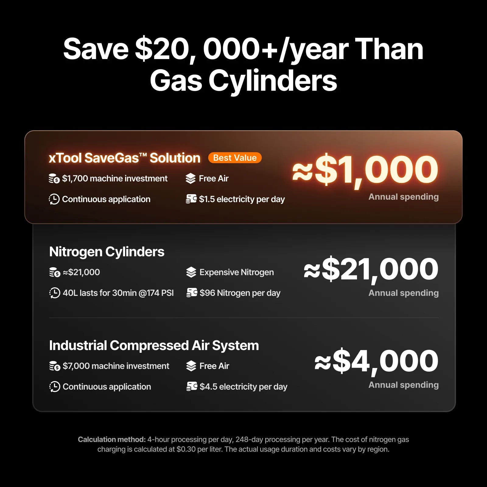 A single 40L nitrogen cylinder lasts just 30 minutes, costing over $20K annually for continuous metalcutting. So why not switch to xTool SaveGas™ solution and stop wasting money on gas tanks? No more nitrogen, argon or oxygen refills. Invest once, cut forever.