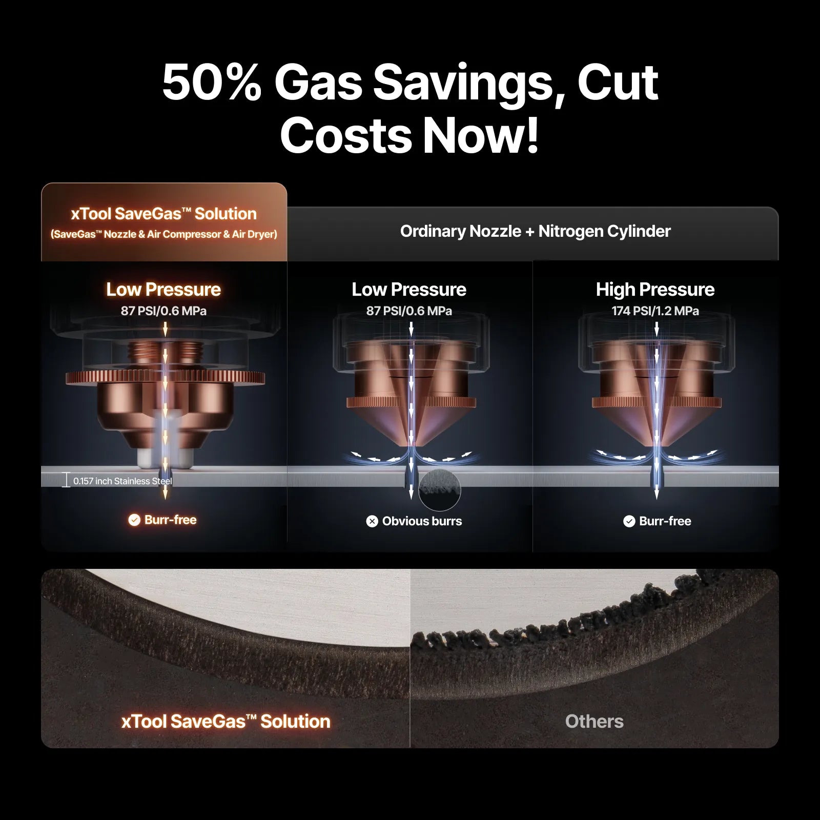xTool self-developed SaveGas™ cutting nozzle features a unique telescopic design that minimizes gas leakage and concentrates airflow for precise cuts. You only need 87 PSI of air pressure to achieve cutting results comparable to 174 PSI of nitrogen-cutting your gas costs to the lowest!