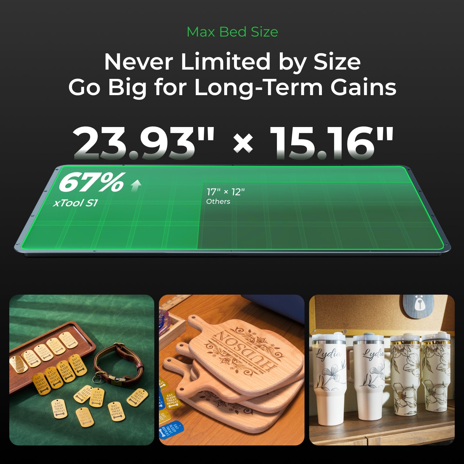 The xTool S1 boasts a large bed size of 23.93" x 15.16" inches and a spacious work area of 19.6" x 12.5" inches.