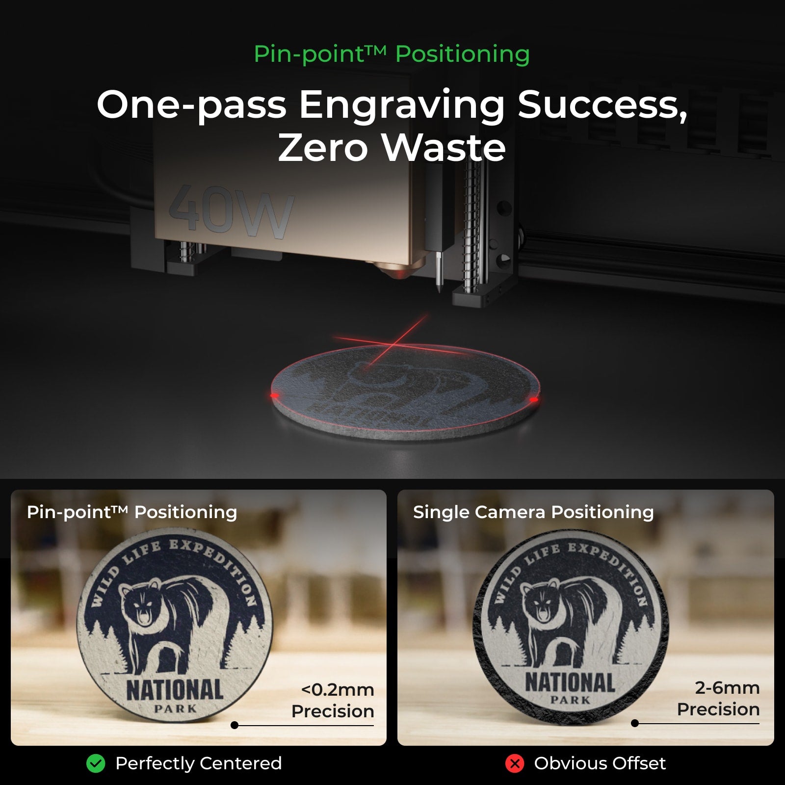 S1 is equipped with revolutionary Pin-point Positioning™️ technology, and is 10 times* more accurate than single-camera systems*. Effortlessly aiding you in accomplishing delicate engraving tasks, bidding farewell to waste and loss caused by positioning deviations.