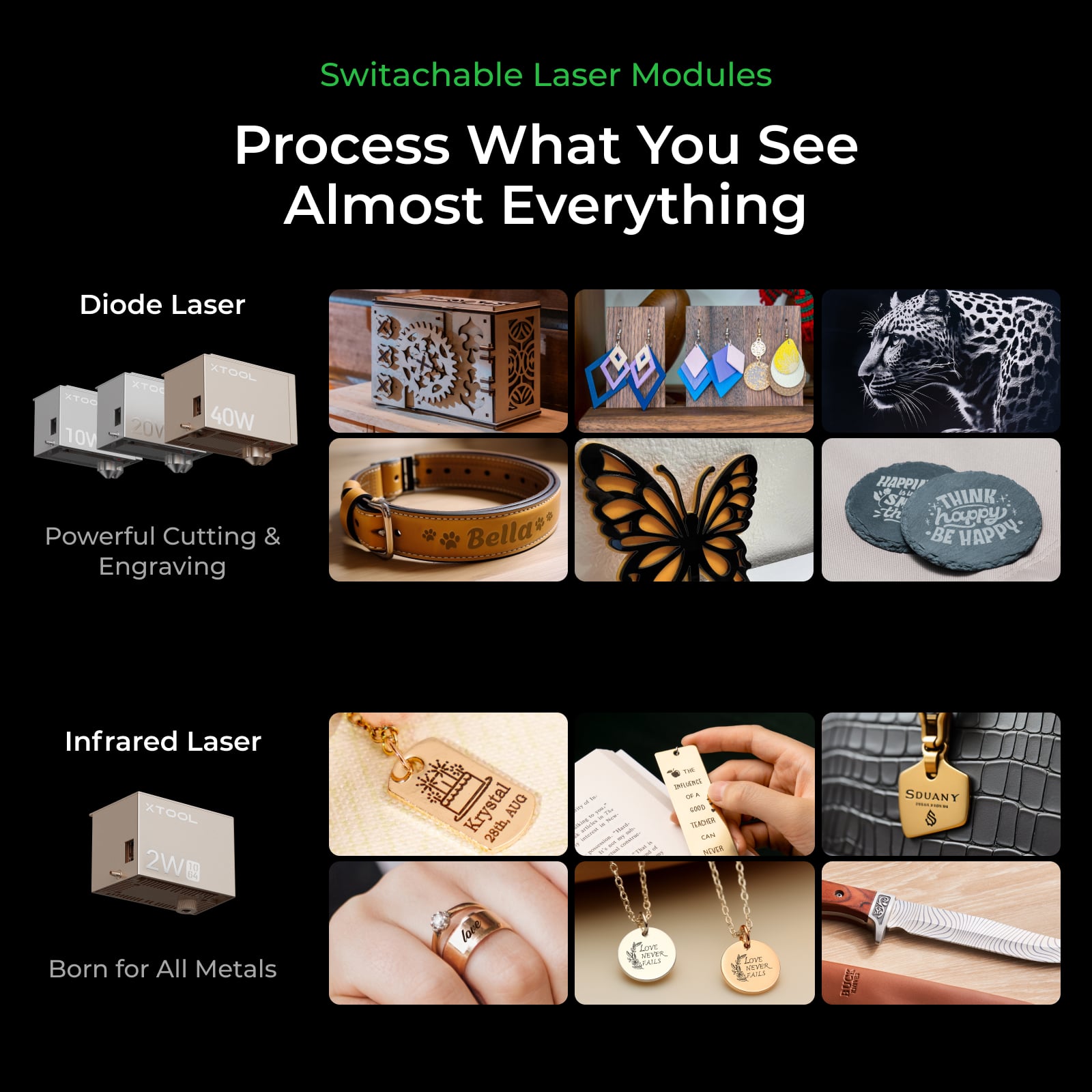 Experience the versatility of our 40W, 20W, and 10W lasers, capable of handling materials like wood, leather, glass, rock, paper, fabric, dark acrylic, and more.