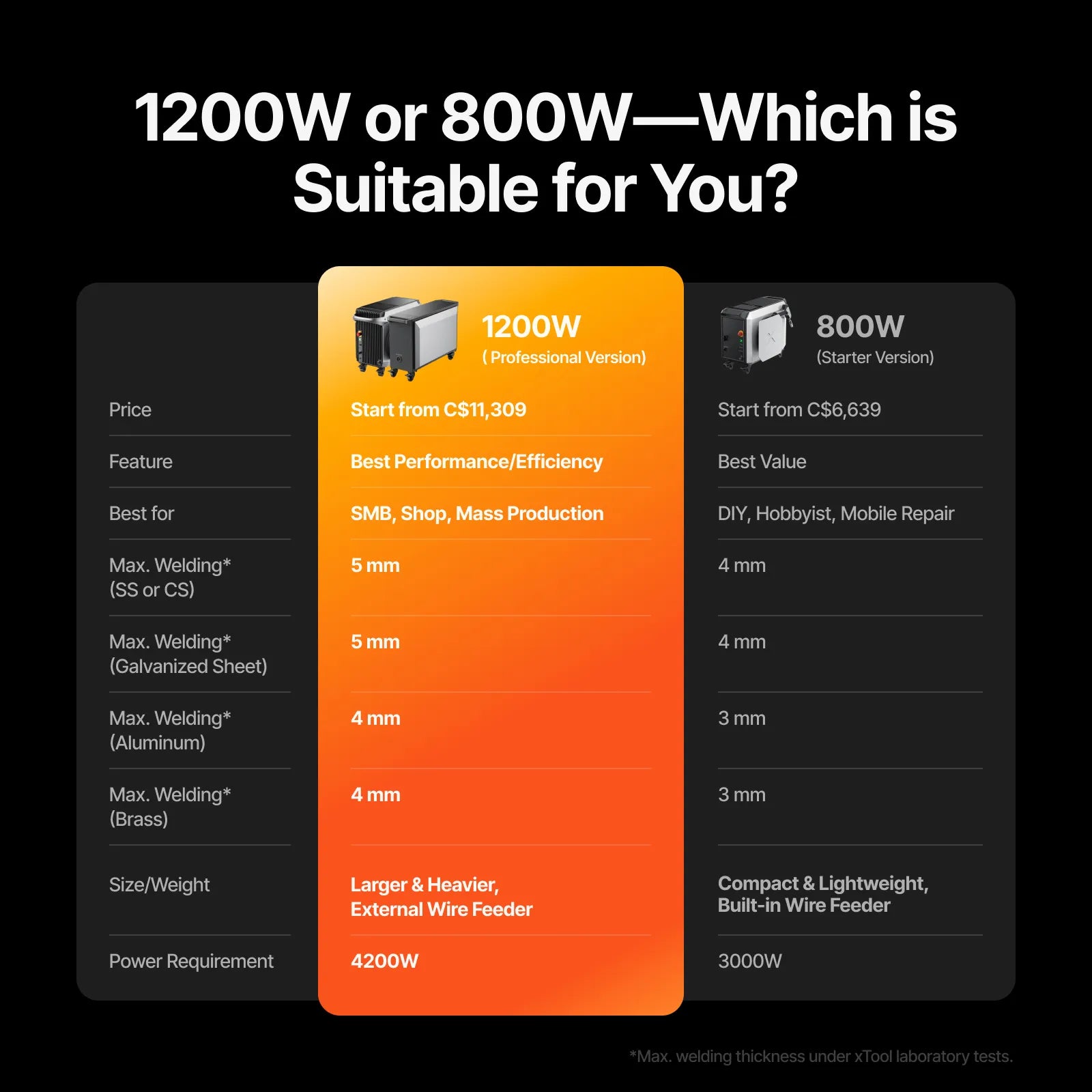 - The 1200W welder can weld up to 5mm stainless steel/carbon steel, while the 800W model handles up to 4mm.