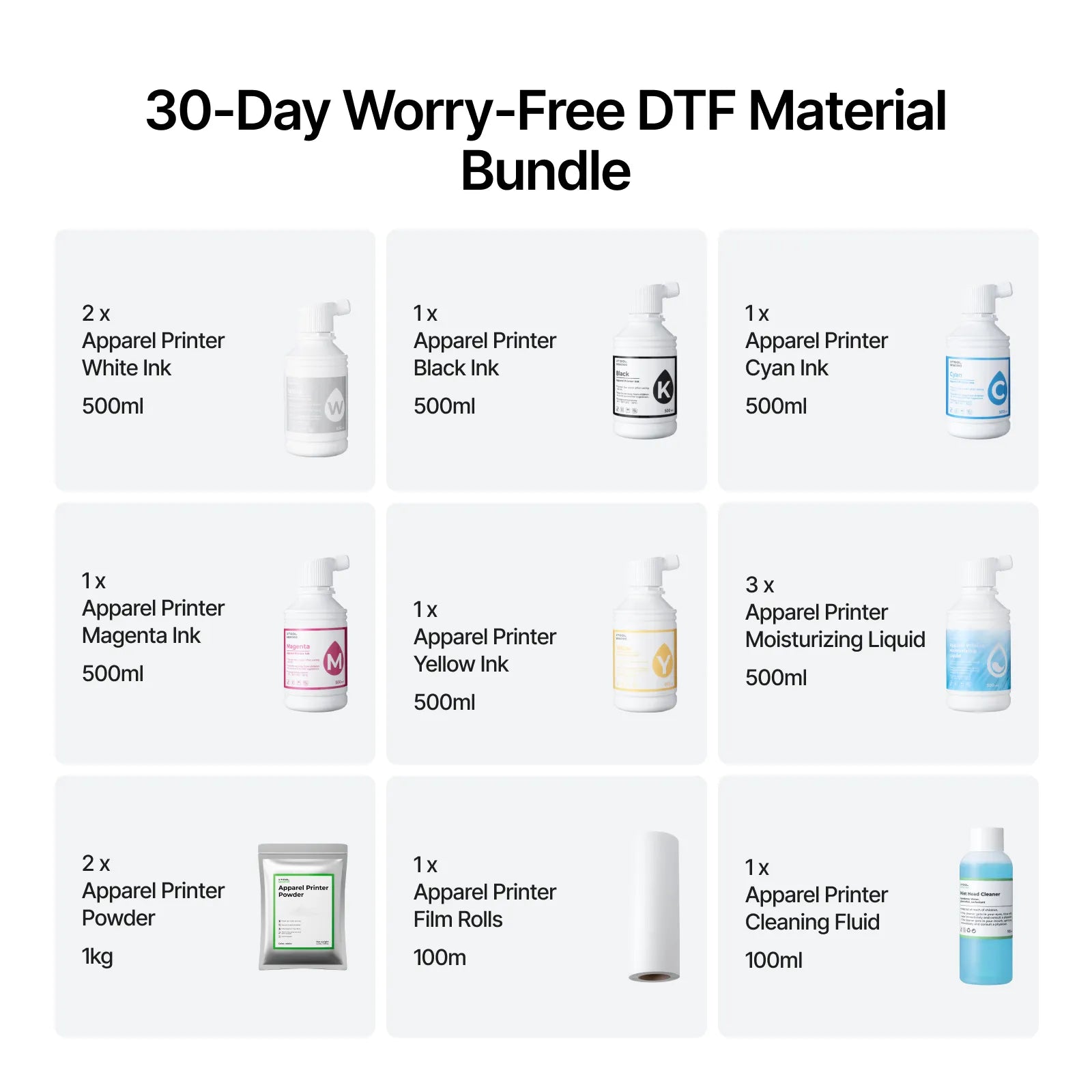- This set includes two bottles of white ink, one bottle each of CMYK ink, one roll of printing film, three bottles of moisturizing liquid, two packets of printer powder, and one bottle of cleaning fluid. Ensure sufficient supply in the short term. (*Please note that the actual consumption rate depends on your printing frequency.)