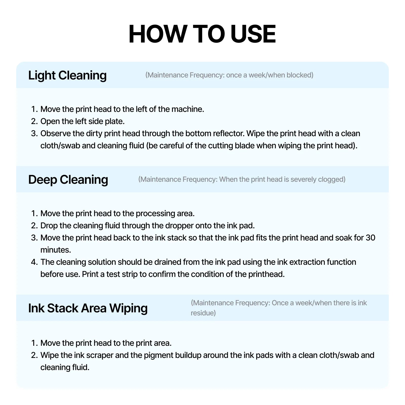 - The cleaning solution must be drained from the ink pad using the ink extraction function before use. Print a test strip to confirm the condition of the printhead.
