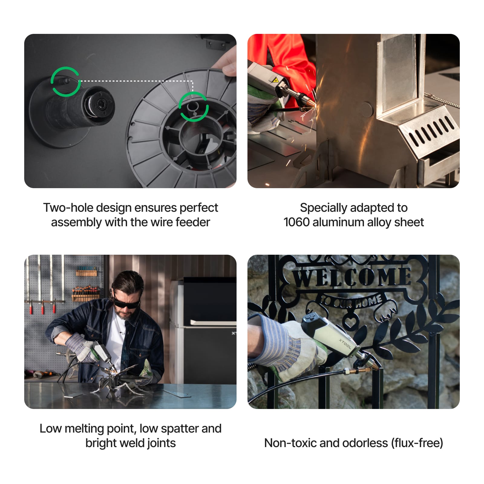 - User-friendly operation. Perfectly adapted to the xTool MetalFab Laser Welder and CNC Cutter. The unique dual-hole design on the welding wire spool ensures seamless installation onto the xTool welder's wire feeder, enabling automatic wire feeding. Smooth wire feeding enhances work efficiency and user experience.