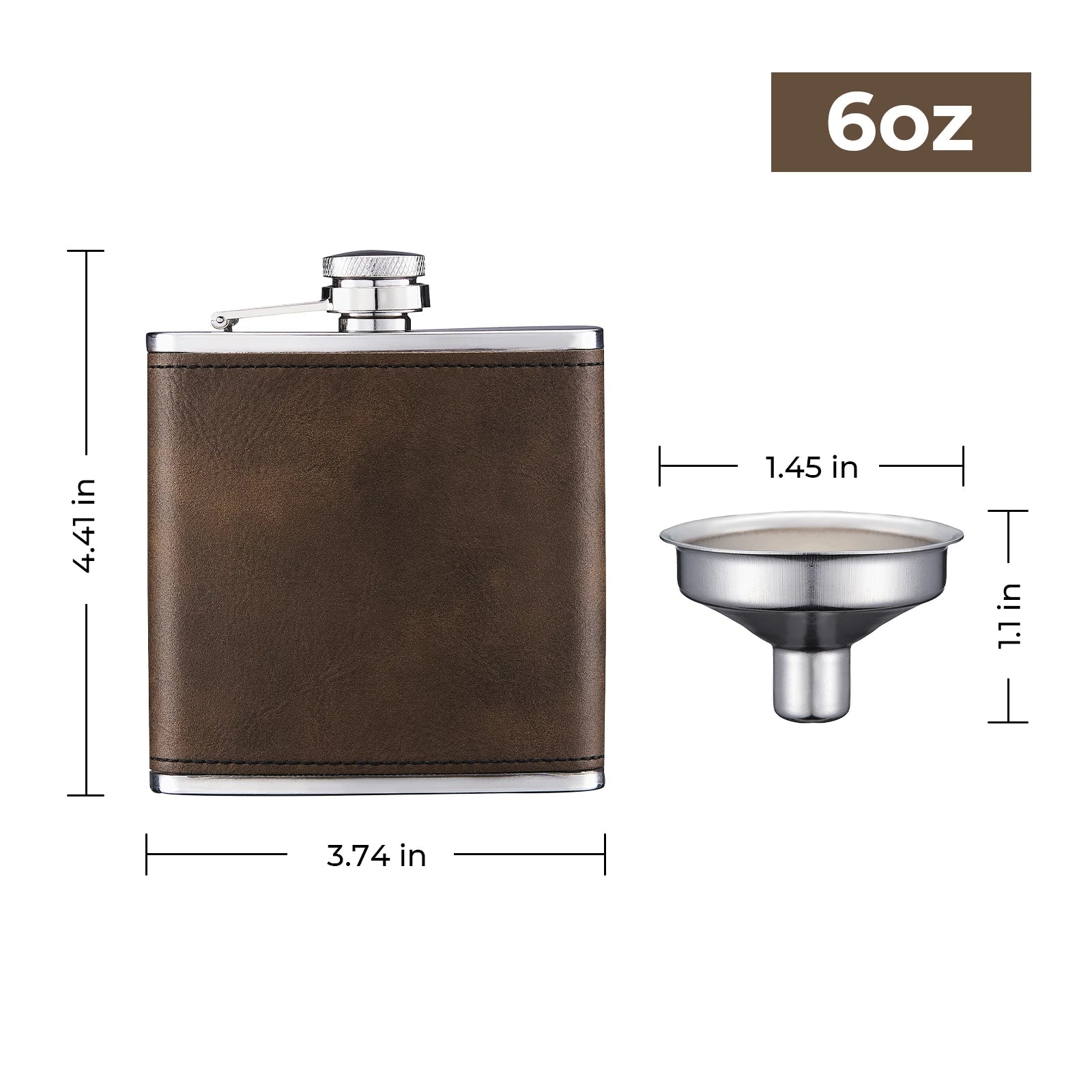 - The stainless steel laserable PU hip flask comes with a stainless steel cap and stainless steel funnel. The cap seals tightly to ensure that vodka, whiskey, or other favorite beverages won't leak and go to waste. The included funnel makes it easy to pour liquids. It comes in its gift box, so you can use it as a gift directly to others.
