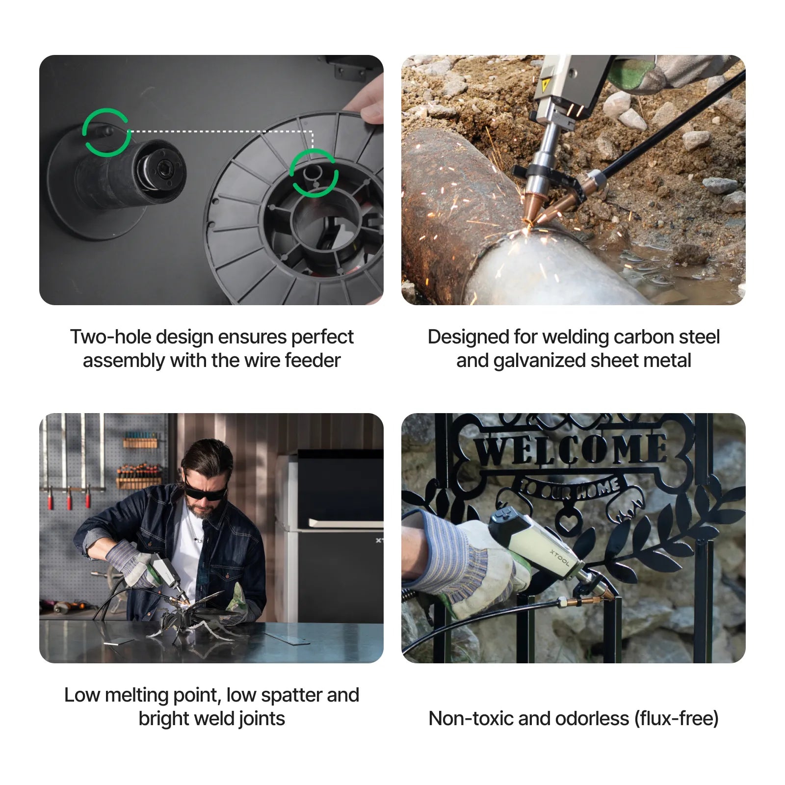 - User-friendly operation. Perfectly adapted to the xTool MetalFab Laser Welder and CNC Cutter. The unique dual-hole design on the welding wire spool ensures seamless installation onto the xTool welder's wire feeder, enabling automatic wire feeding. Smooth wire feeding enhances work efficiency and user experience.
