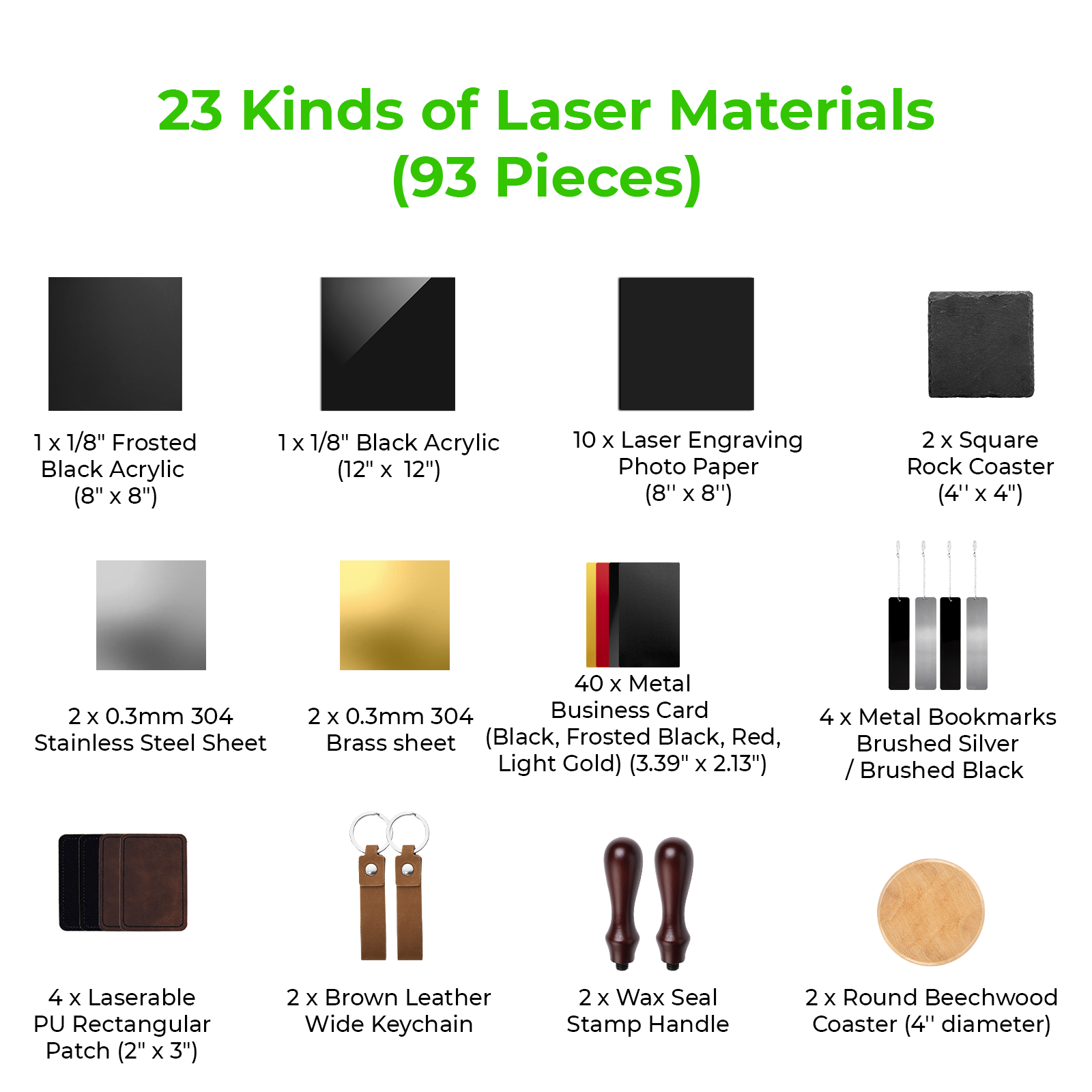 - A must-have material pack with 16 kinds of popular materials, 93pcs laser materials, and 4 types of complementary tools. Perfect for getting started with laser machines such as xTool F1/F2 Ultra.