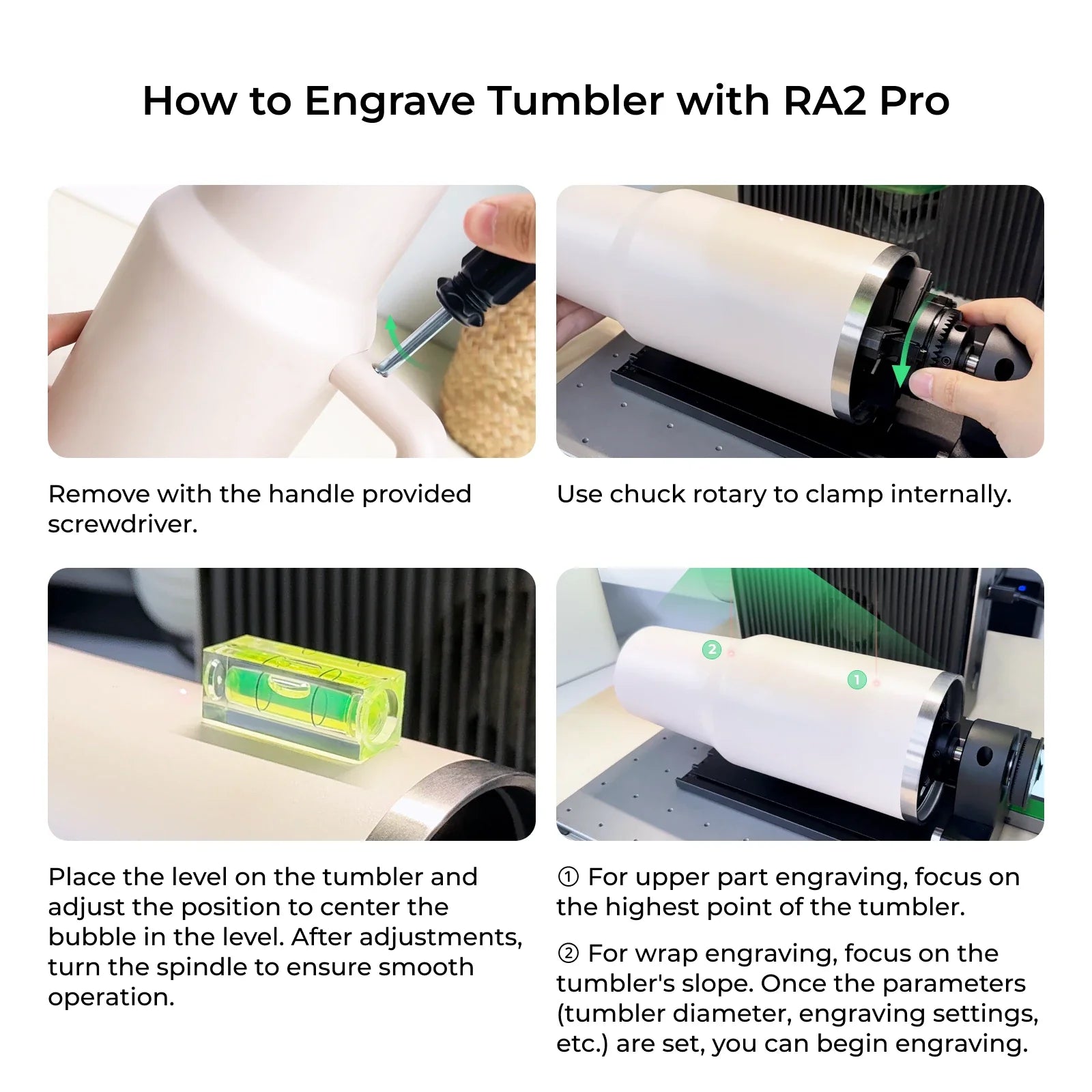 Due to the different colors of each computer, there will be some errors between the color and the actual color. Suggestions include using the provided screwdriver to remove the handle and utilizing rotating attachments for processing when conducting extensive laser engraving. Exercise caution when using the cup to contain hot liquids to prevent scalding when using a straw.