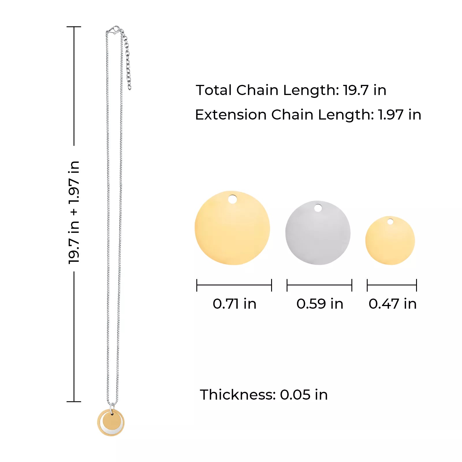 - Product DimensionThe three round hang tag sizes are 0.47 in, 0.59 in, and 0.71 in. The total chain length is 19.7 inches, with a 1.97-inch extension chain.
