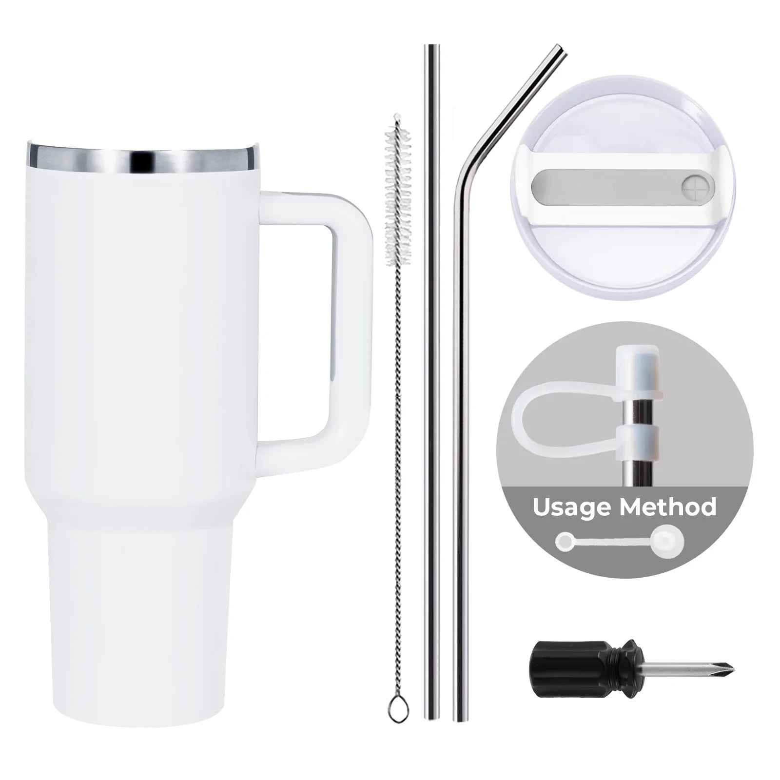 - Each tumbler has two stainless steel straws, silicone straw tips, a straw brush, and a complementary screwdriver that facilitates the disassembly of the handle for engraving on the cup body.