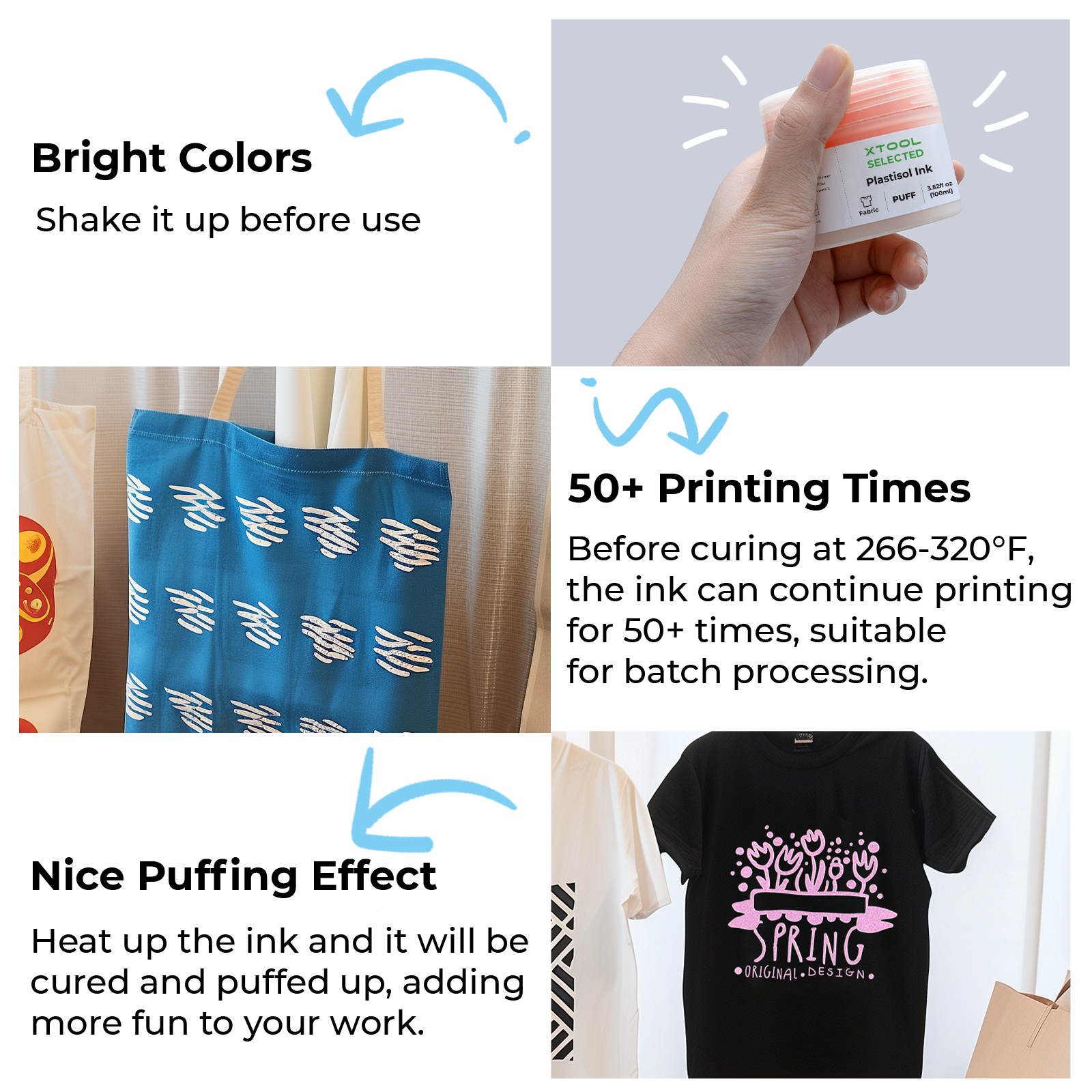 - Professional quality puff plastisol screen printing inks - The brand of choice for professional screen printers, the premium inks provide vibrant colors and excellent coverage. Puff plastisol ink for screen printing fabric can be used with xTool Heat Press to produce a nice puffing effect when heated.