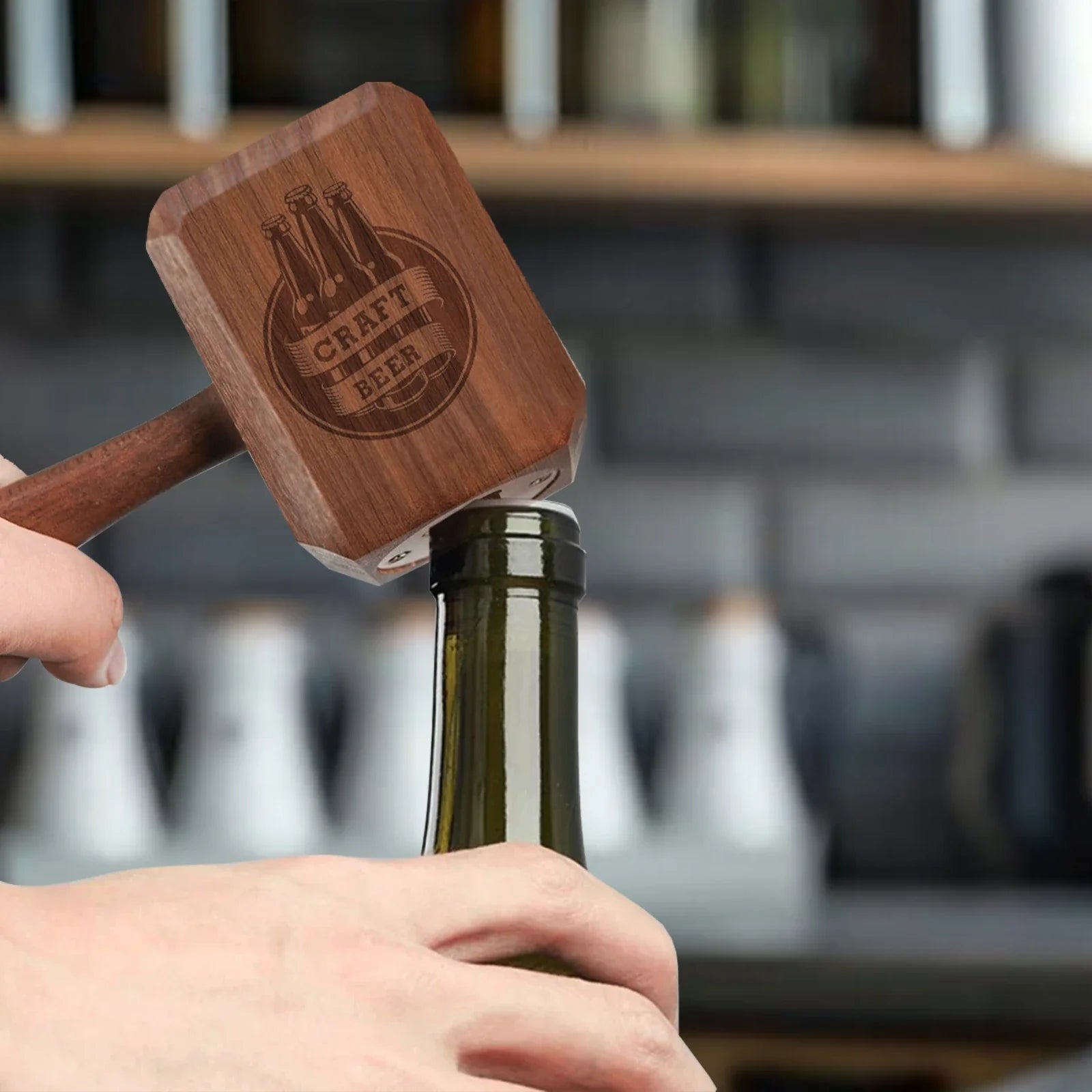 - The wooden hammer bottle opener is a practical and beautiful bottle opener that will help you open bottle caps quickly. The hammer shape adds a fun and ornamental touch. The bottle opener is equipped with a magnet, which can be used with the matching base to stand the hammer bottle opener up and create a very unique decoration. The bottle opener can also be held upright on any magnetic surface, such as a table, for easy storage and access.