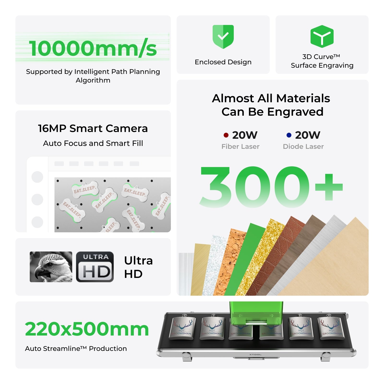 “Setting the materials to your desired engraving / cutting effect can be time consuming. xTool arranged 21 people in 6 months to test 400+ materials and build the world's first material setting library. Now, users can set a specific material through a click of the desired effect on the photo. ”